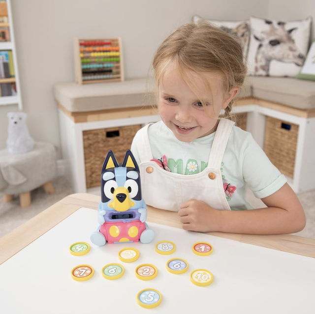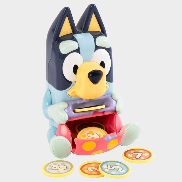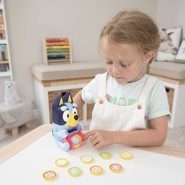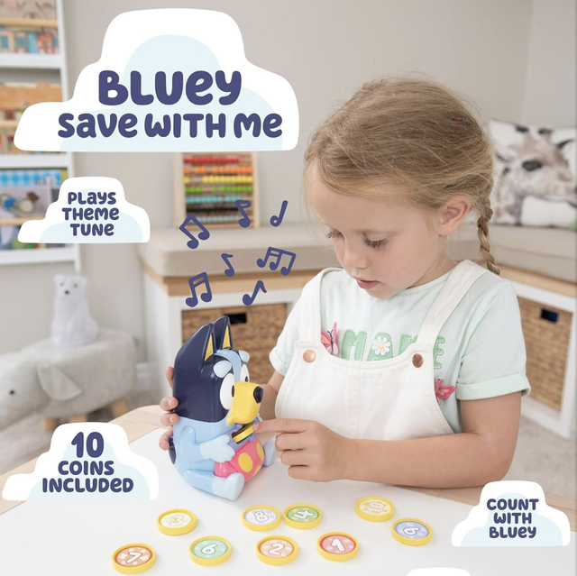 Includes 10 numbered coins. Insert coins to hear different sounds effects and character sounds. Press Bluey's nose to hear the Bluey theme tune. Requires 2 x AA batteries (included). Suitable for ages 2 years+.